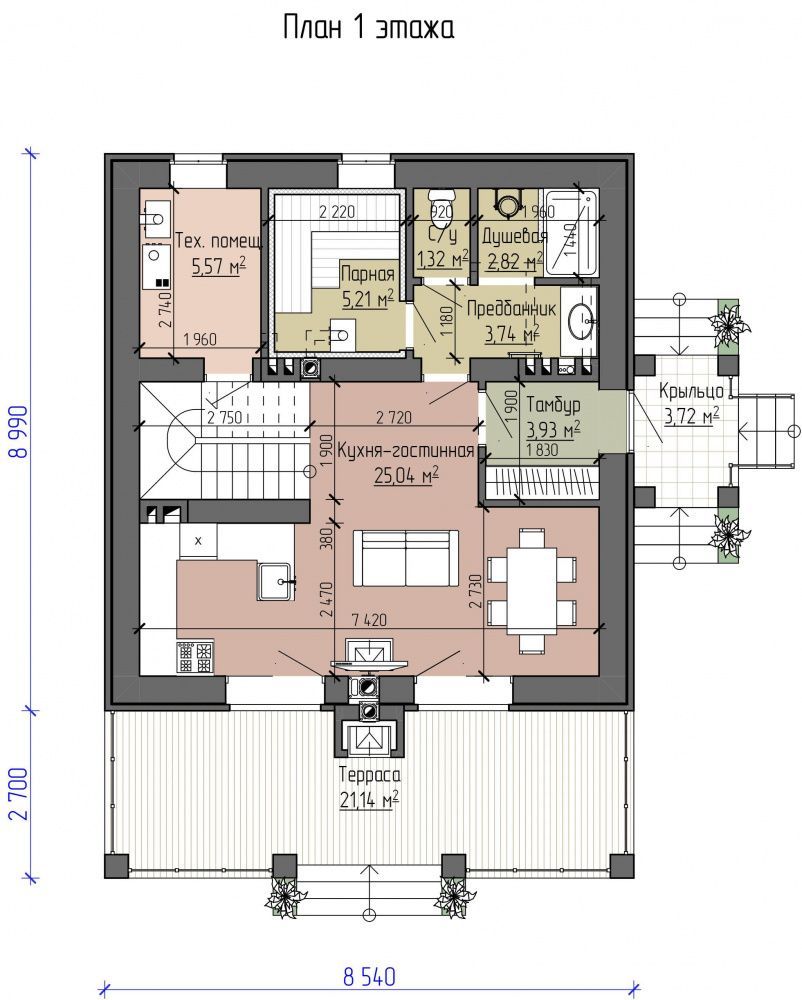 • На первом этаже здания размещены: крыльцо, терраса, тамбур, техническое помещение, предбанник, душевая, парная, с/у, кухня-гостиная.